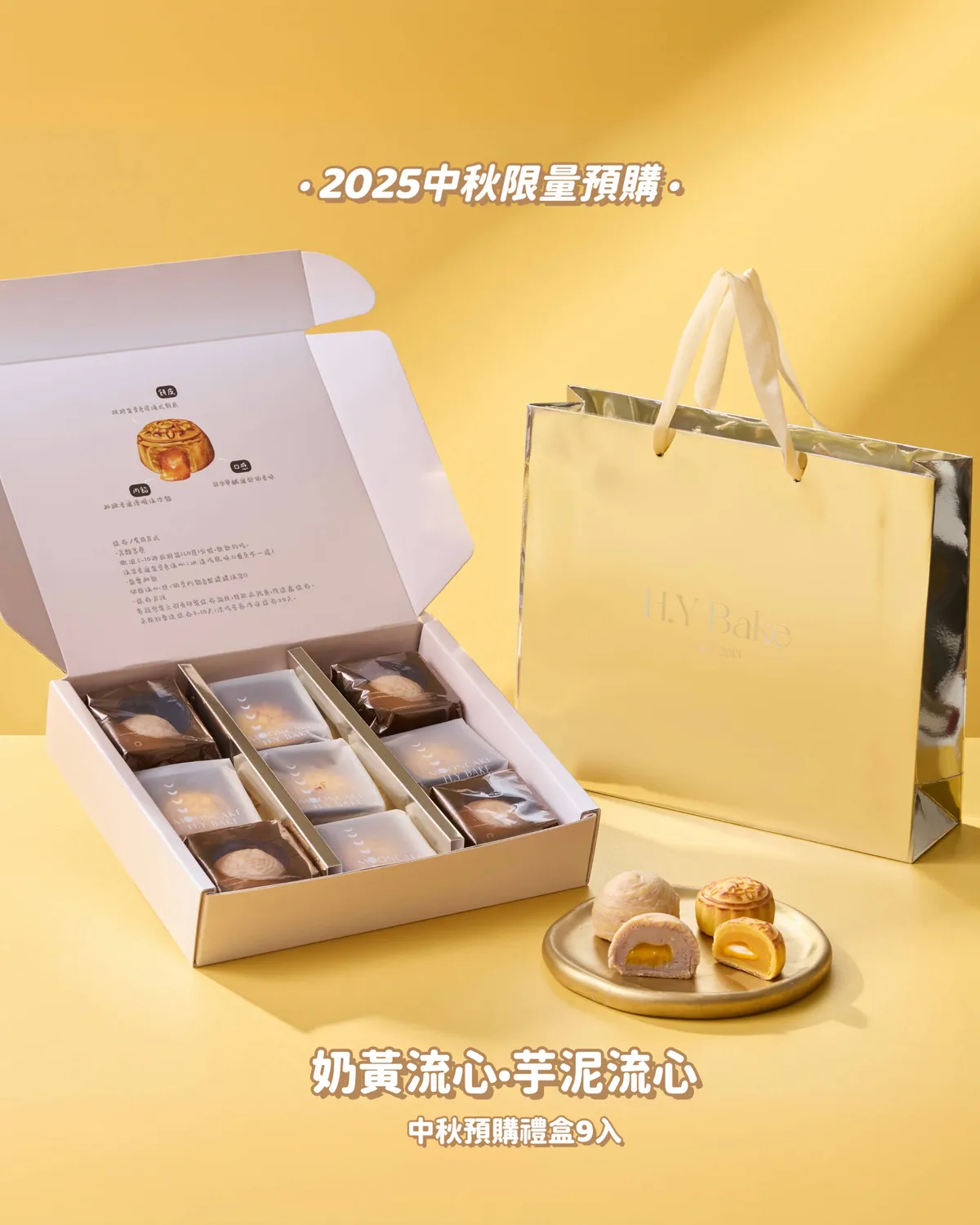 2025中秋限量2000盒💫售完為止 中秋送禮首選|奶黃流心 芋泥流心 咬一口 金黃餅皮 內餡包著奶味香濃滑順流沙 嘴裡充滿著甜中帶鹹的滋味賞味期限每顆獨立包裝都有放乾燥劑隔絕空氣可以常溫放置10天,沒吃完可在冷凍20天 流心月餅每顆205大卡 蛋奶素可食用